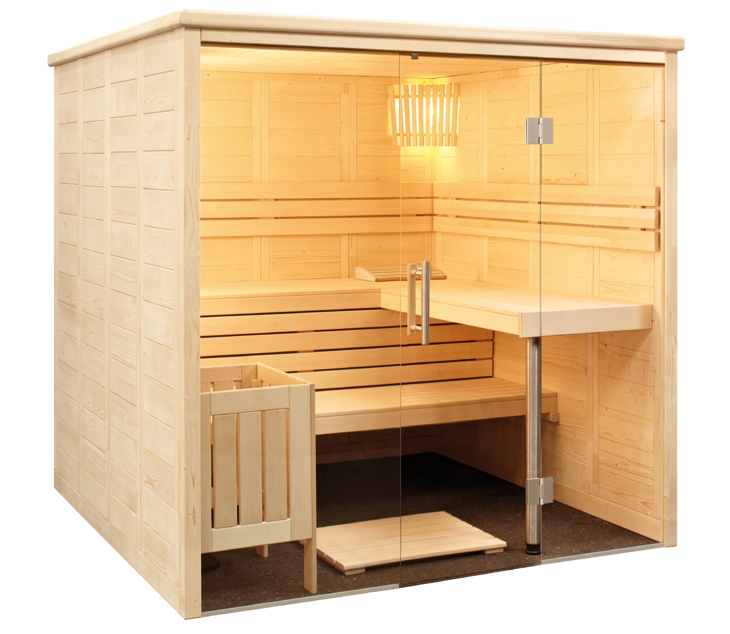 - Robuste Massivholz-Konstruktion: Die Kabine aus massiver Fichte gewährleistet nicht nur Langlebigkeit, sondern schafft auch ein angenehmes und gesundes Saunaklima.